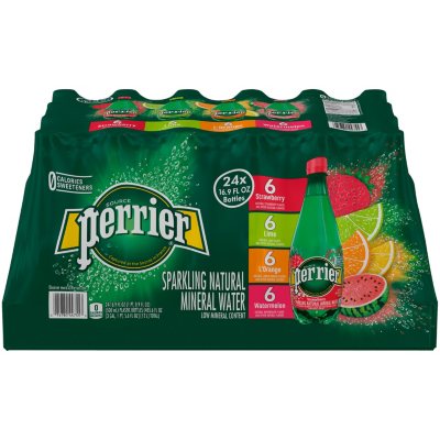 The perrier carbonated mineral water assorted flavor pack contains three crisp thirst quenching varieties.